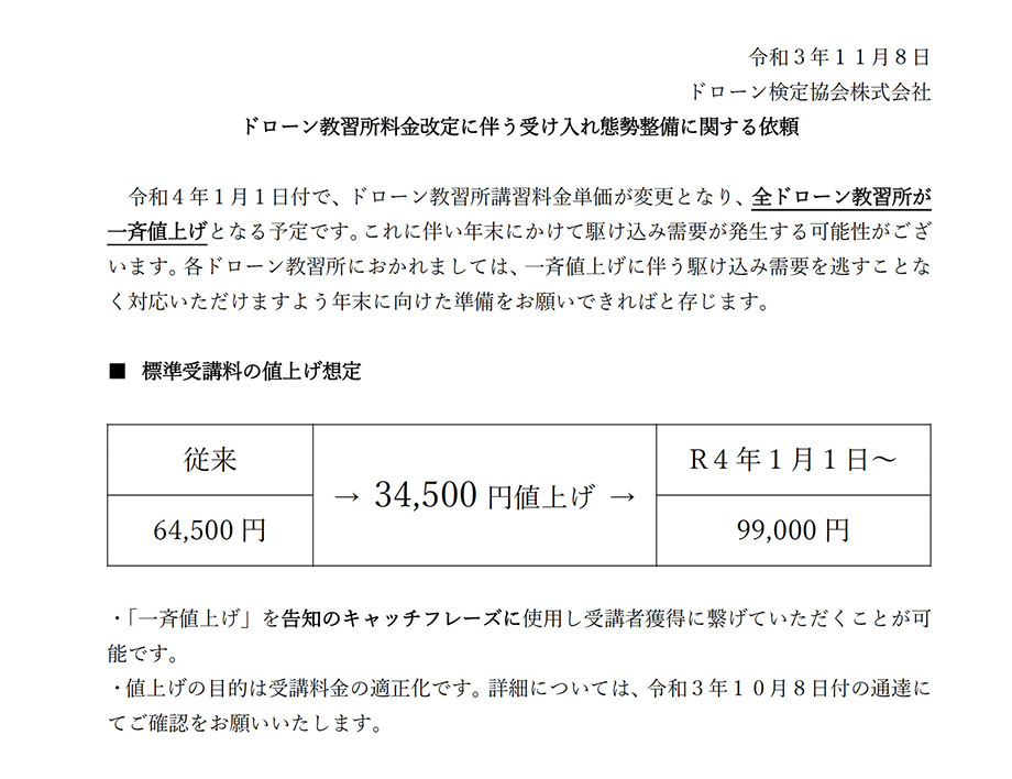 ドローン検定協会より下記の通達により、当スクールは「入校金=0円」とし10万円以下の「99,000円」とさせていたたきますので、何卒ご理解くださいますよう、よろしくお願い申し上げます。