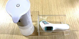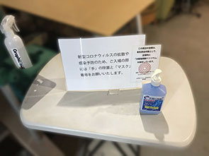 3階建て各階に次亜塩素酸ナトリウムスプレー常時設置、アルコール殺菌設置しております。