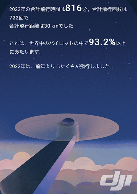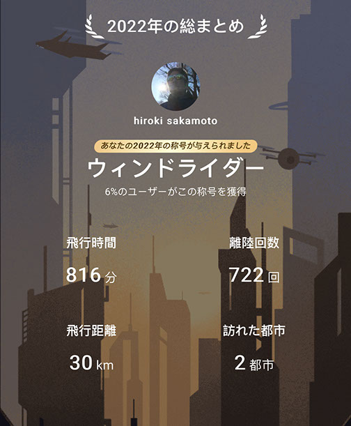 世界のドローン出荷機体数は推定400万機といわれ、世界シェア85%のDJIは340万台とされその所有者数は114万人となり、坂本廣樹はその中の上位6%の称号ウインドライダーを取得しました。